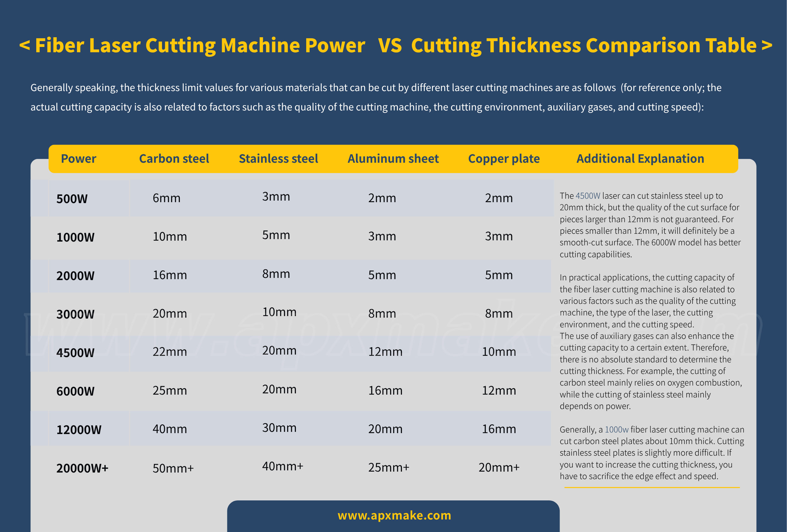 Generally, the thickness limits for cutting various materials using different laser cutting machine power are shown below (for reference only; actual cutting capacity is also related to various factors such as the quality of the cutting machine, the cutting environment, the assist gas, and the cutting speed):